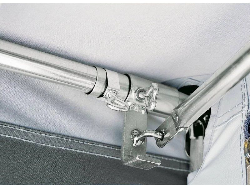 Een optimale pasvorm aan de voortent door middel van het speciale bevestigingssysteem onder de petluifel van de voortent. Het speciale luifelframe is voorzien van 3 bevestigingsbeugels die op het frame van de voortent worden gemonteerd. Deze bevestigingsbeugels kunnen universeel op zowel stalen als aluminium voortenframes worden gemonteerd in de buisdiameters 25 en 28. Voor 32 mm frames leveren wij een aangepaste bevestigingsbeugel.
